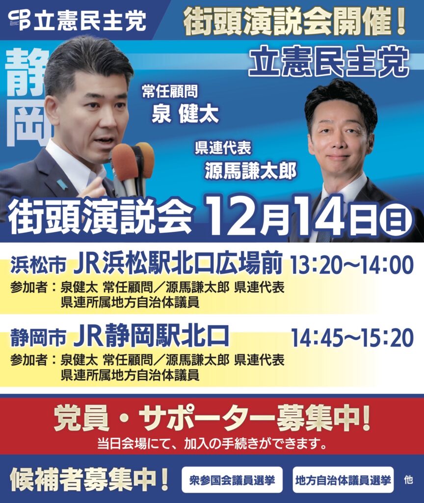 泉健太常任顧問が来静し、街頭演説会を開催します。